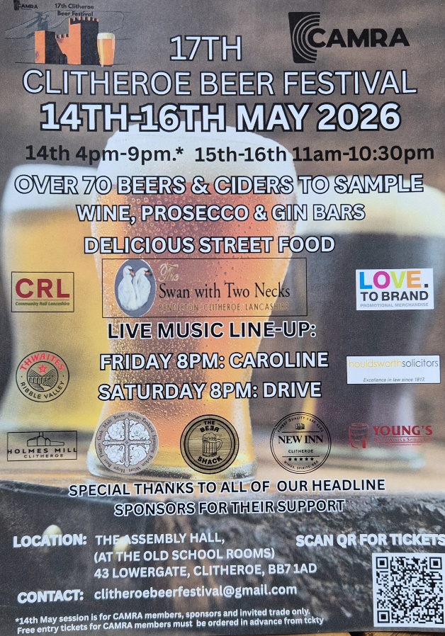 The next Clitheroe Beer Festival will run at St Michael & St John’s Assembly Room in Clitheroe from May 14-16, 2026. Try over 70 real ales, craft beers, ciders perries, ciders, gins and wine and enjoy live music and food on site…